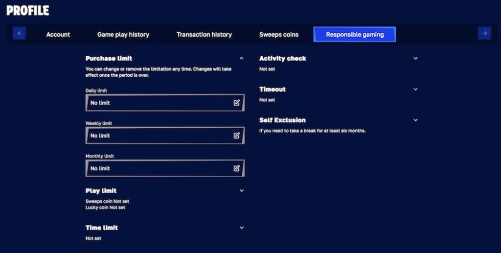 Purchase limits can be set daily, weekly, and monthly, and are all fully customizable to allow you to adapt your limits to suit your needs. Play limits are also available for the same time frames, and these apply to both LC and SC.