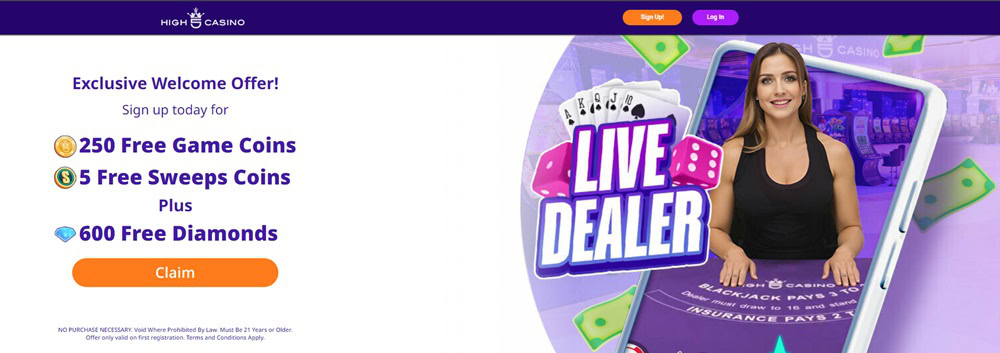 While most sweeps casino welcome bonuses involve premium and free currency, High 5 takes it a step further by offering new players 250 Game Coins, 5 SC, and 600 Diamonds.